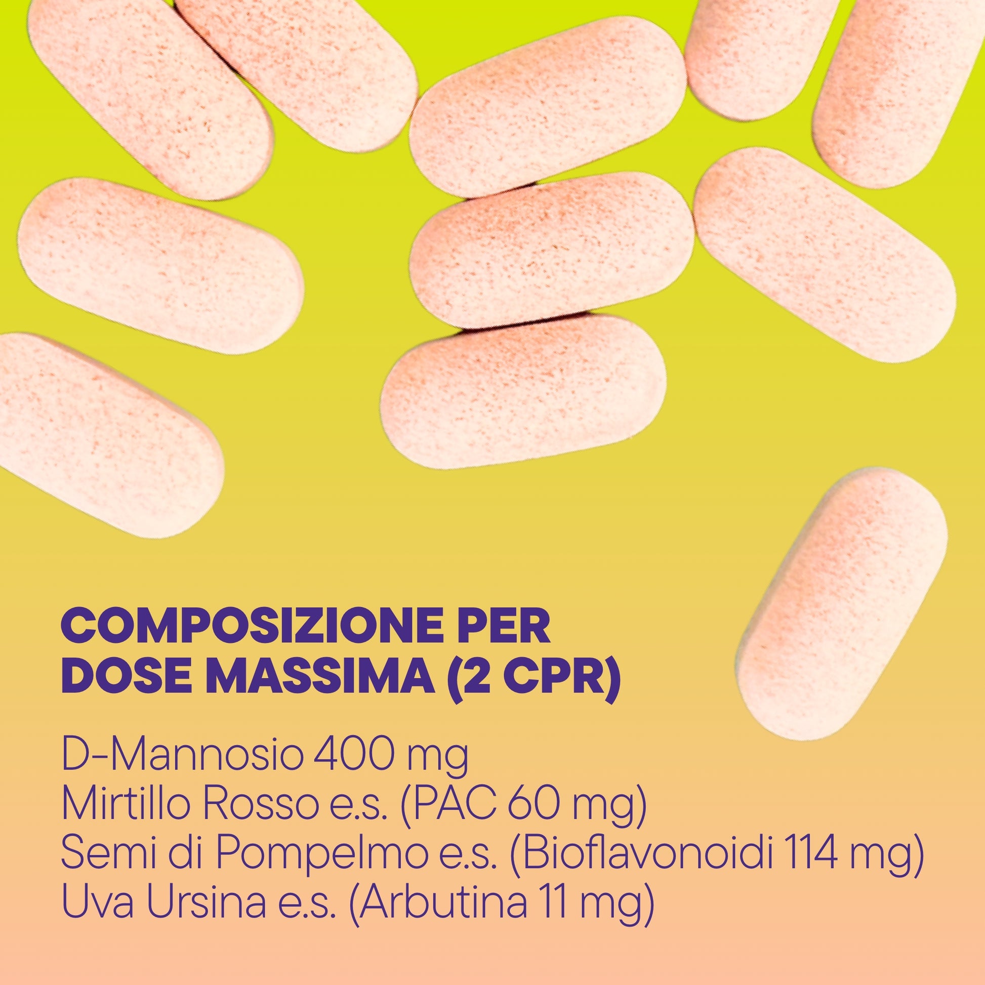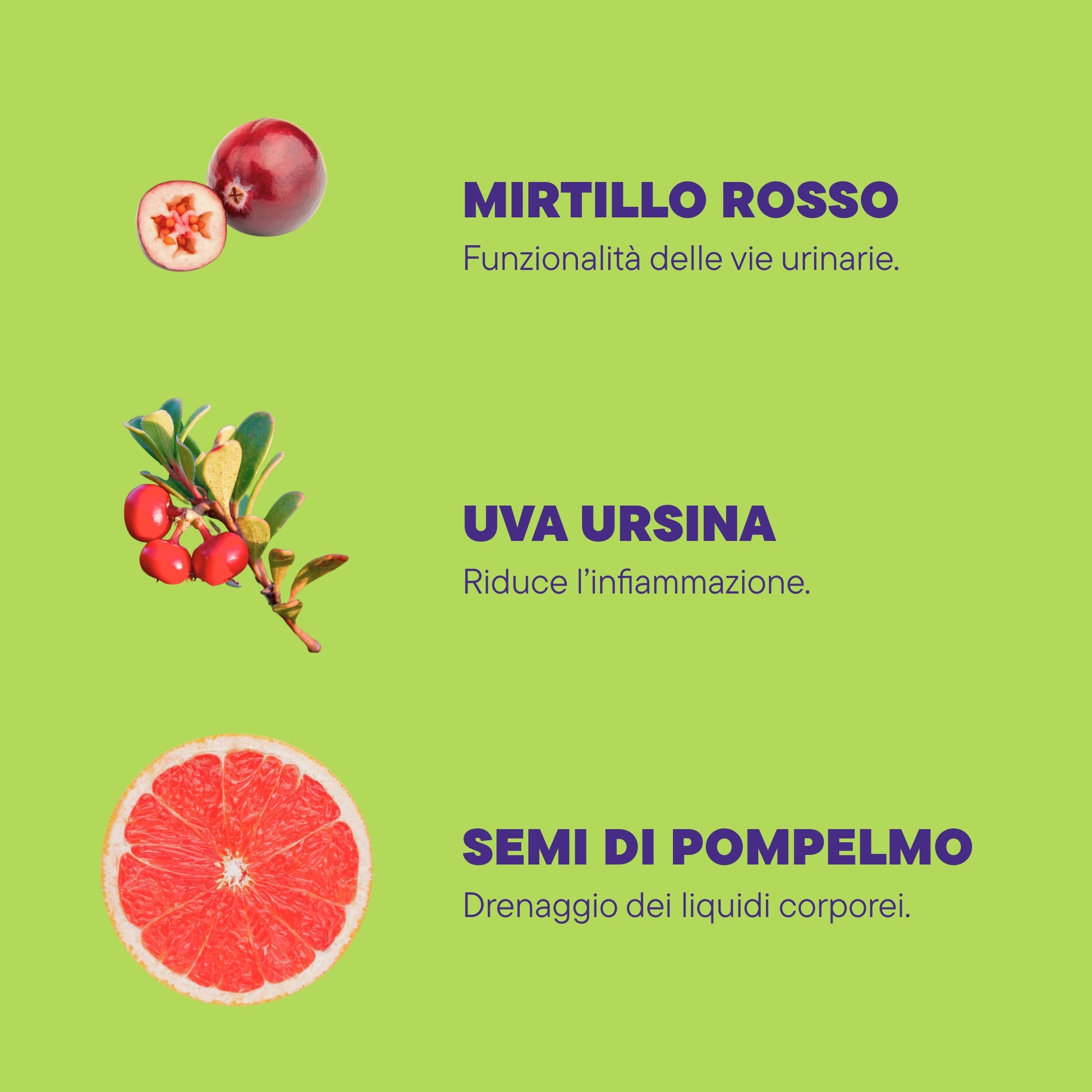 D-mannosio, mirtillo rosso, uva ursina e semi di pompelmo: una combinazione mirata per sostenere la salute delle vie urinarie e prevenire le infezioni recidivanti, in particolare quelle da E. coli.